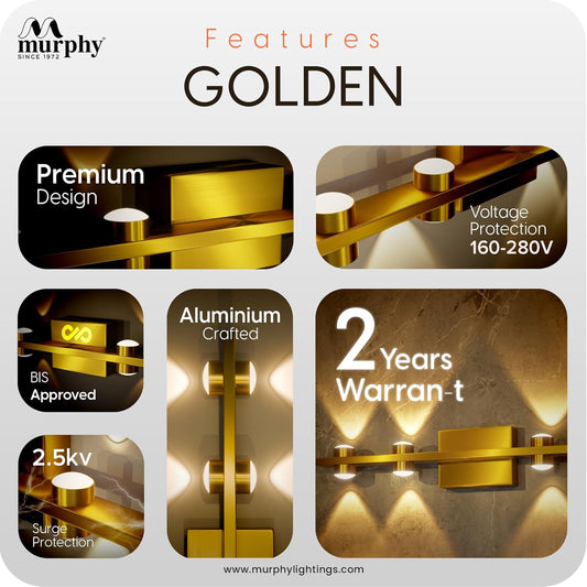 Murphy LED Stylish Up/Down Wall Light – Warm White, Rustproof Aluminum Body (3 Up & 3 Down, Gold Finish) (with 2 Years Warranty)
