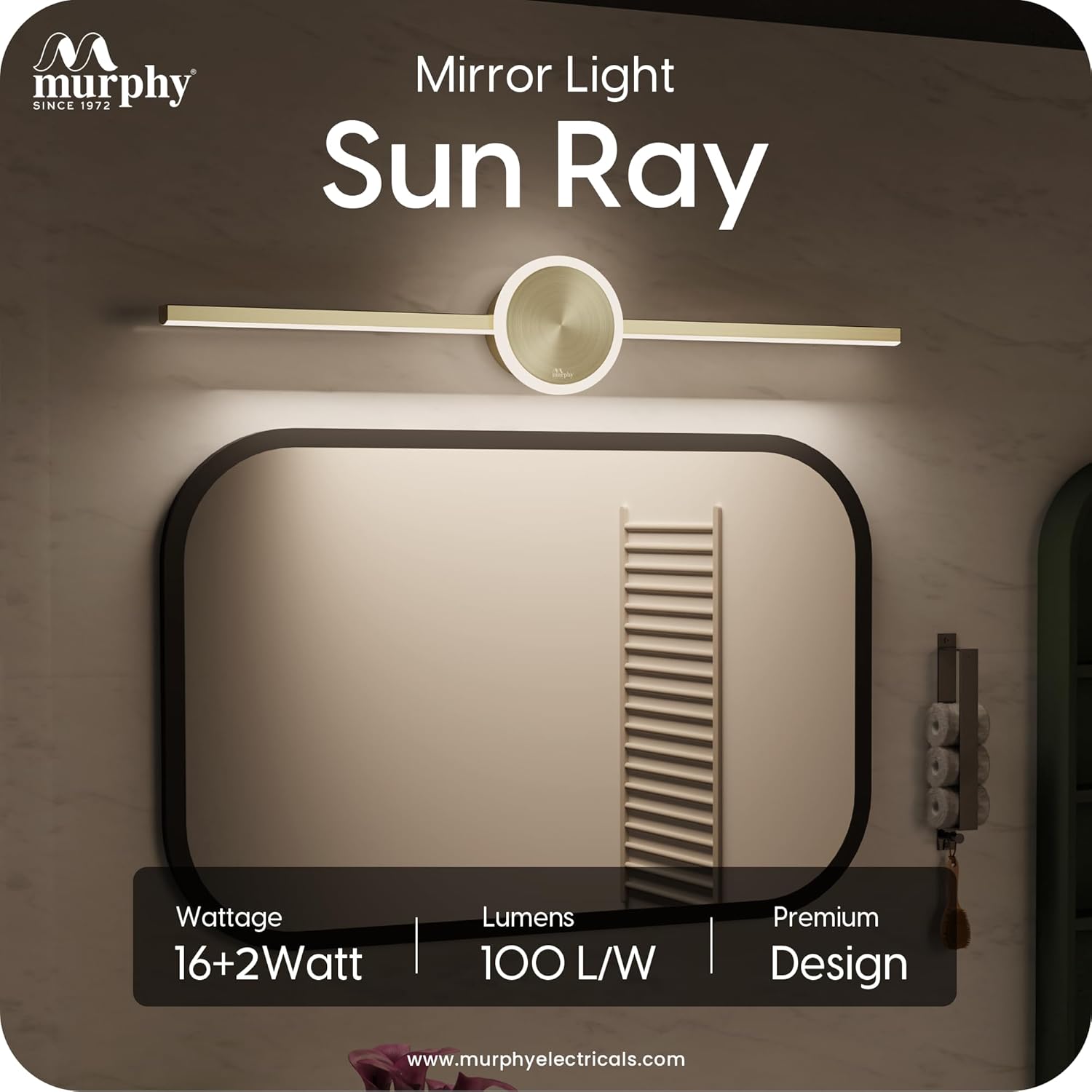 Murphy 16W+2W LED Mirror Light | 3 Color Changing (White/Warm/Natural) | Full Brass Finish – Sun Model, Modern Over Mirror Vanity Light