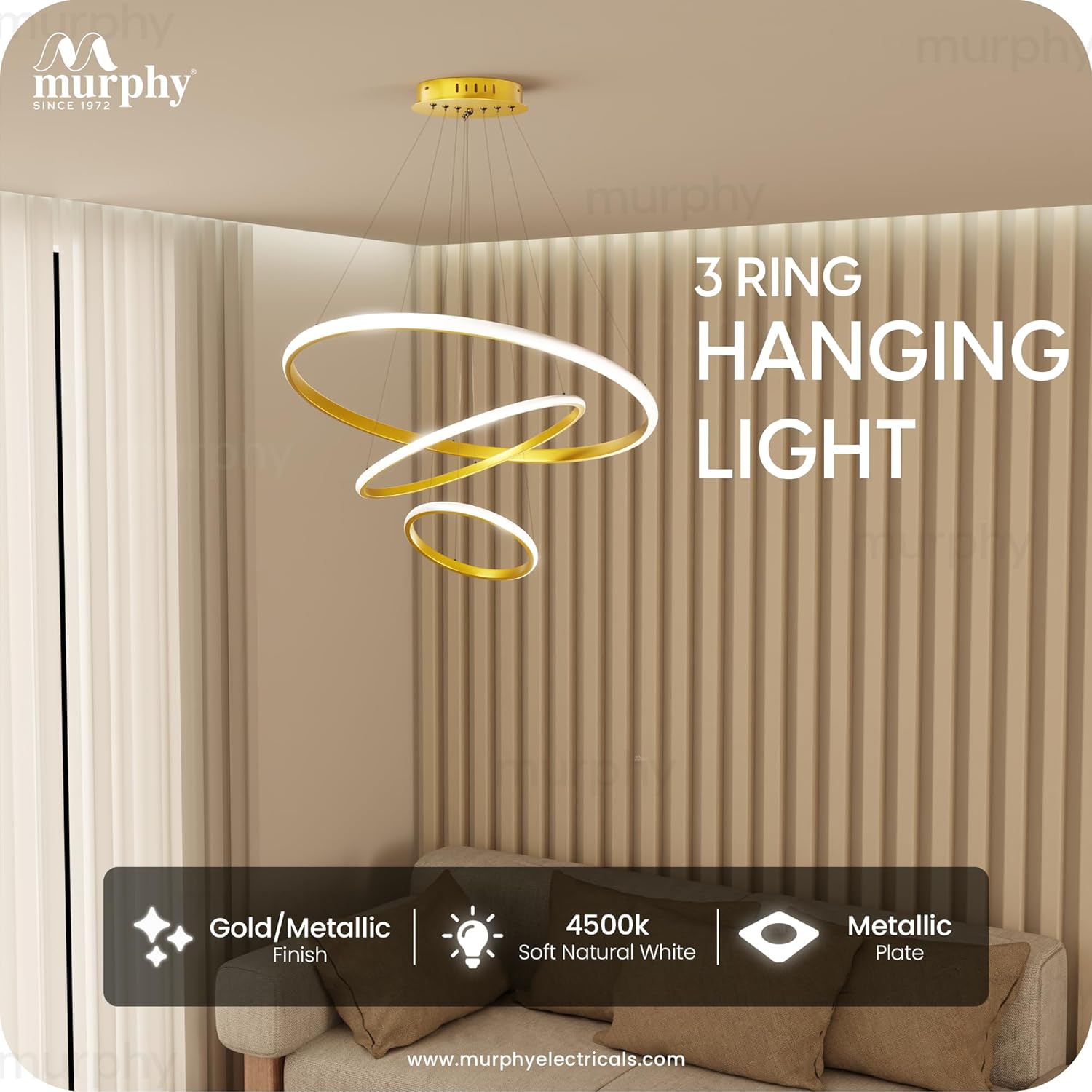 Murphy 3 Ring Modern LED Chandelier Ceiling Lamp | Gold Finish Pendant Light with 3 Color Modes (Cool White, Warm White, Natural White) for Living Room, Hall, Dining, Lobby